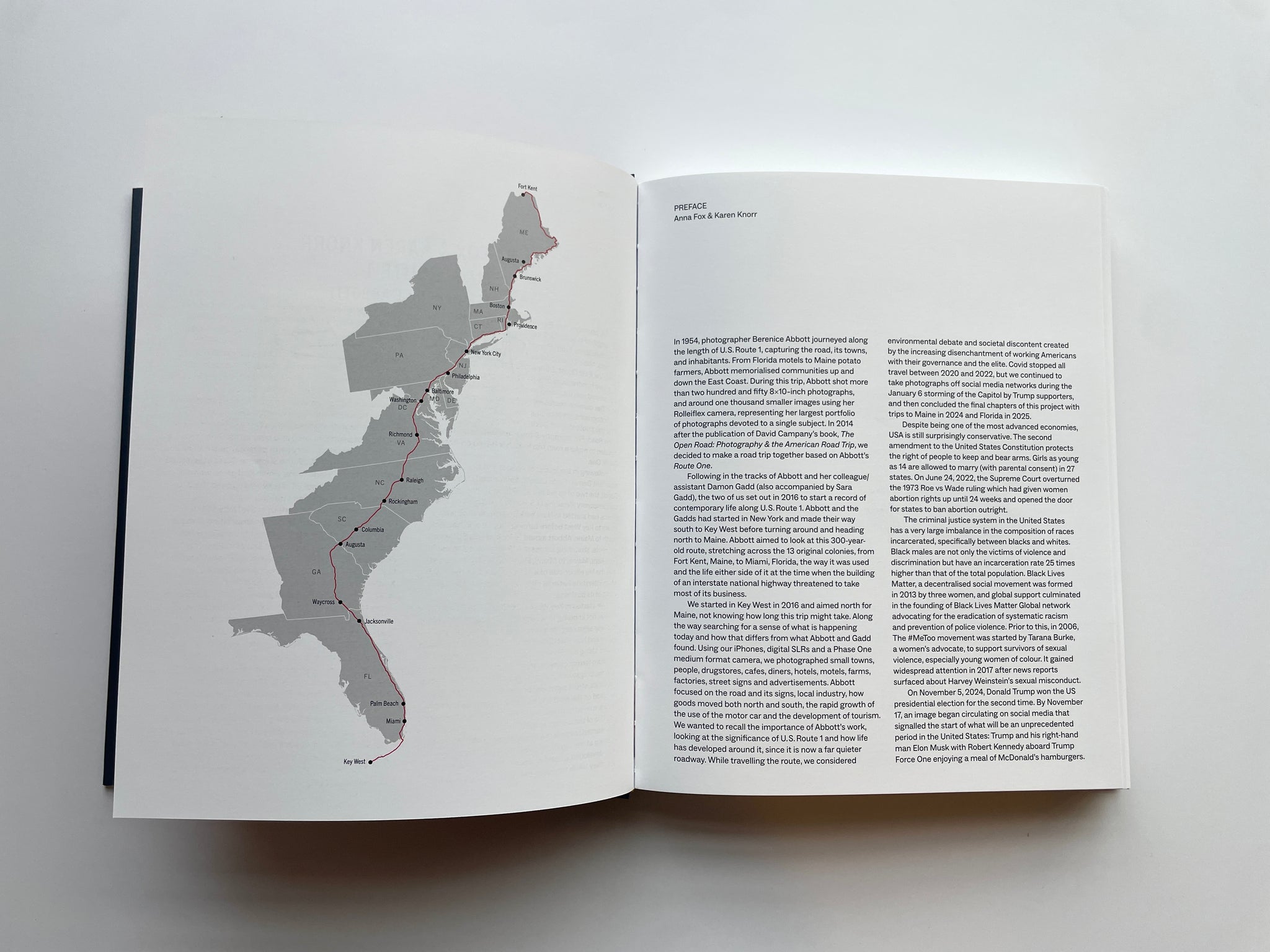 Following in the tracks of Berenice Abbott and her colleague/assistant Damon Gadd (also accompanied by Sara Gadd), Karen Knorr and Anna Fox set out in 2016 to start a record of contemporary life along U.S. Route 1. during the age of Trump. They started in Key West in 2016 and aimed North for Maine, not knowing how long this trip might take. Along the way Fox and Knorr searched for a sense of what is happening today and how that differs from what Abbott and Gadd found. Using their iPhones, digital SLRs and a Phase One medium format camera, they photographed small towns, people, drugstores, cafes, diners, hotels, motels, farms, factories, street signs and advertisements. Abbott focused on the road and its signs, local industry, how goods moved both north and south, the rapid growth of the use of the motor car and the development of tourism. Fox and Knorr wanted to re-call the importance of Abbott’s work, looking at the significance of U.S.1 and how life has developed around it, since it is now a far quieter roadway. From 2016 – 2024, Fox and Knorr traversed the U.S. Route, considering current environmental debate and societal discontent created by the increasing disenchantment of working Americans with their governance and elites. Covid stopped all travel between 2020 and 2022, but Fox and Knorr continued to take photographs off social media networks during the Jan 6 storming of the Capitol by Trump supporters. In 2024 they made two last trips to Maine and Florida, concluding this chapter of their work.